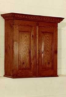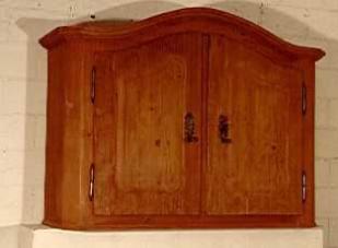 Beschrieb: Hängeschrank mit geschweiftem Kranz (teilweise neu), alles voll massiv Fichtenholz, gewachst. Innen 2 Tablare