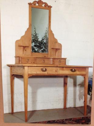 Beschrieb: Frisiertisch mit Schubladen und Spiegelaufsatz, alles voll massiv Kiefernholz handgezinkt, gewachst.