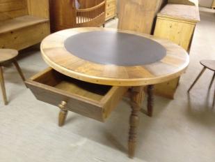 Beschrieb: Grosser, runder Tisch mit 2 durchgehenden Schubladen, alles voll massiv Kirschbaum und Fichtenholz, handgezinkt, gebeizt + lackiert.